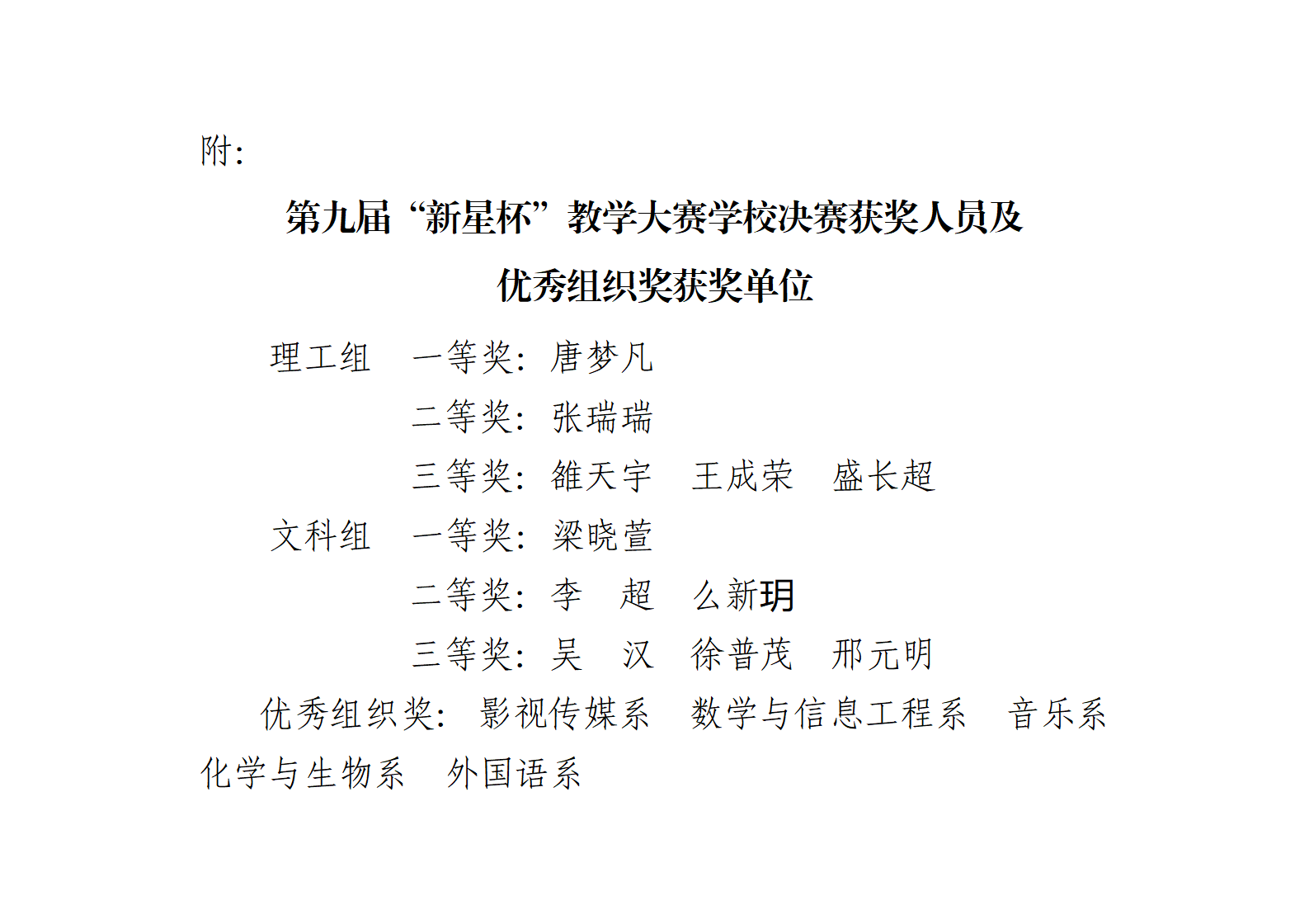 经过激烈角逐,数学与信息工程系唐梦凡老师、影视传媒系梁晓萱老师分别获理工组和文科组一等奖;化学与生物系张瑞瑞等3位老师获二等奖;音乐系吴汉等6位老师获三等奖。影视传媒系等5个单位荣获“优秀组织奖”(具体名单附后)。