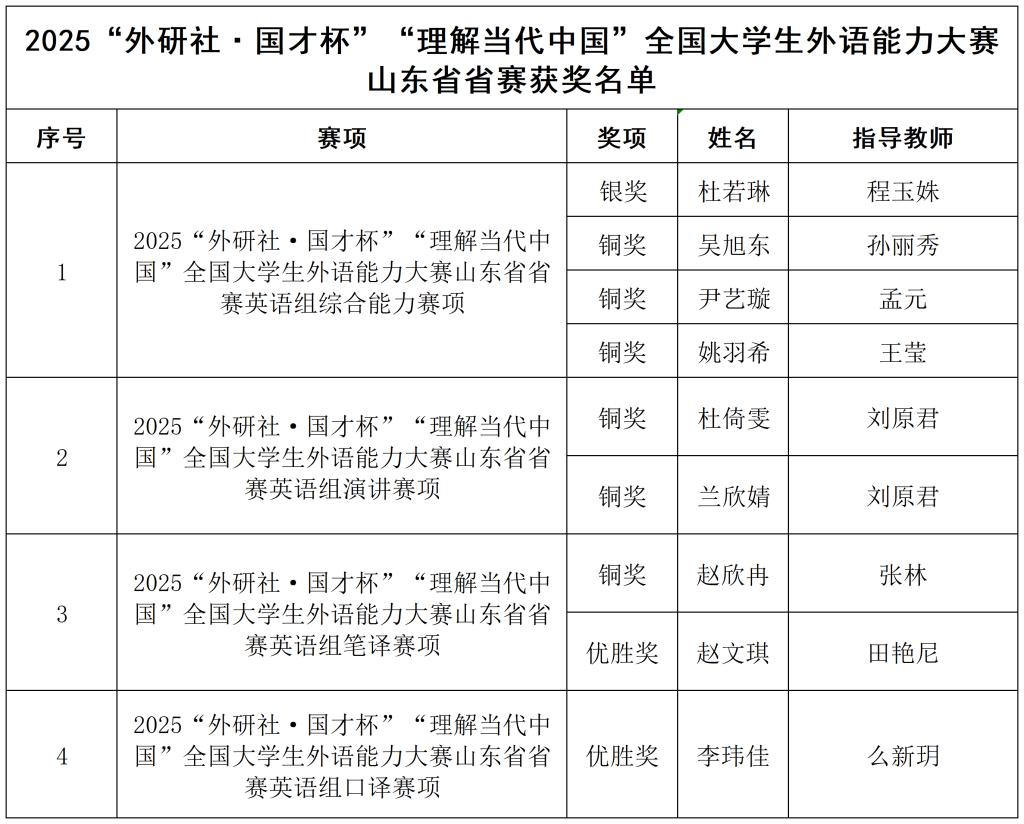 本网讯 近日,2025“外研社・国才杯”“理解当代中国”山东省大学生外语能力大赛圆满落幕。本次大赛设置综合能力、笔译、演讲、口译、短视频五大赛项。我校参赛学子凭借扎实的外语功底、深入的家国认知与全面的综合素养,在各赛项中捷报频传,最终斩获银奖1项、铜奖6项、优胜奖2项的优异成绩,生动诠释了当代大学生对中国发展的深刻理解与青年担当。