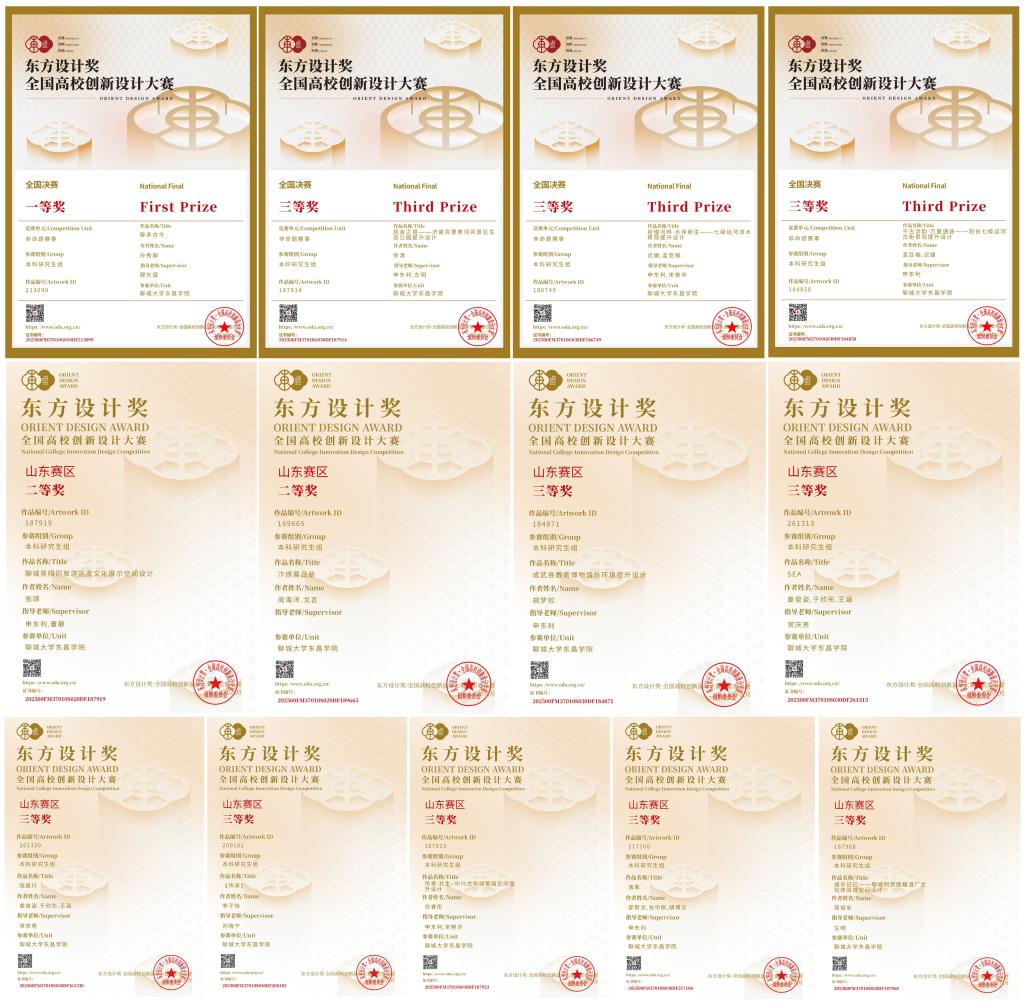 本网讯 近日,东方设计奖·全国高校创新设计大赛获奖名单正式公布。我校美术设计系教师程光熠、申东利、宋艳华、左明、董静、常庆男、刘晓宁指导学生获全国决赛一等奖1项、三等奖3项,山东赛区二等奖2项、三等奖7项。
