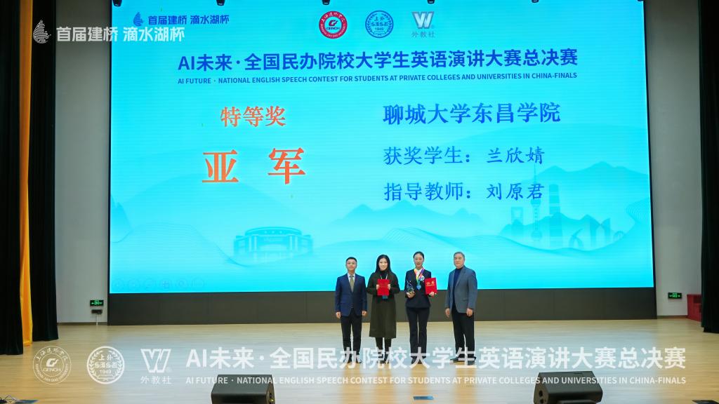 本网讯 12月26至28日,首届“滴水湖杯”AI未来·全国民办院校大学生英语演讲大赛总决赛在上海建桥学院举办。由我校外国语系教师刘原君指导的学生兰欣婧、杜倚雯分别获得全国亚军(特等奖)1项、二等奖1项。