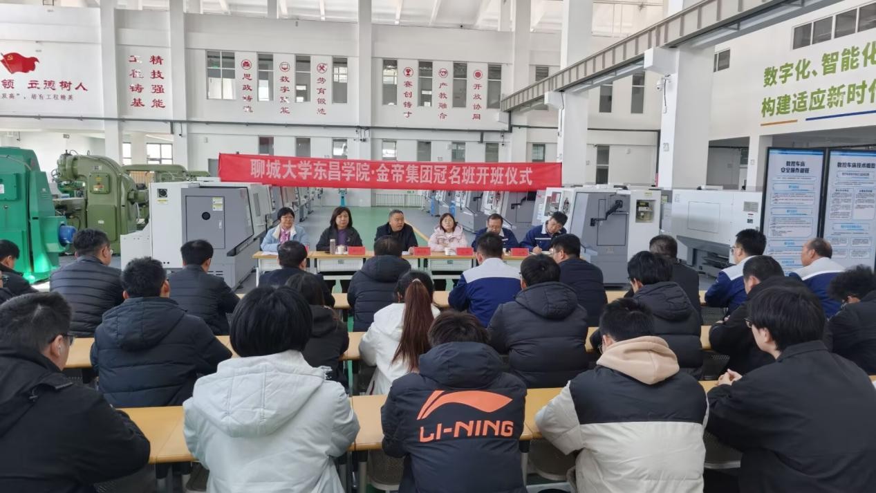 本网讯 3月19日,我校与山东金帝精密机械科技股份有限公司冠名班开班仪式,在工程训练中心举行。副院长孔令乾、教务处处长赵桂清、机电工程系领导班子和骨干教师代表,山东金帝人力资源总监吕霞、人才发展经理王庆坤、技术部门核心负责人,冠名班全体学生出席仪式。仪式由机电工程系党总支书记田金菊主持。